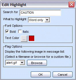 The Edit Highlight dialog is displayed when you want to create a new or modify an existing highlight. This dialog allows you to configure the search phrase and how you wish it to be emphasized.