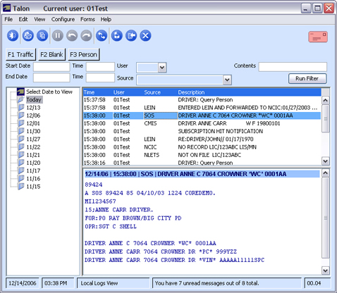 Talon keeps a local log of all the messages run on a specific computer. In the local logs, you can view messages from all users who used Talon on that computer. To view the local logs, select Local Logs from the View menu.
