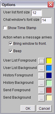 The Options window from the Configure menu allows you to customize the look and behavior of the user list and chat windows.